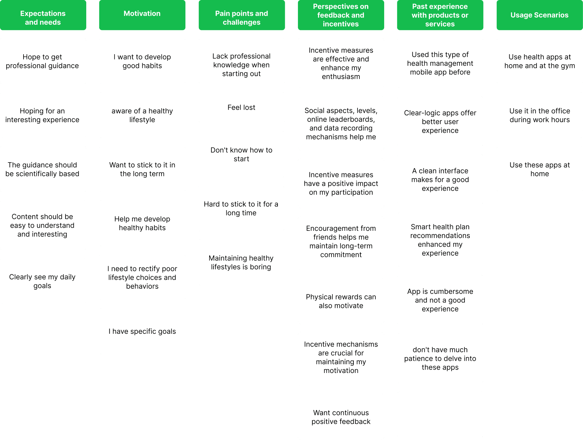 The extracted key sentences or ideas are categorised and organised according to relevance, and each group is next analysed to summarise the main findings. This helps to better understand user needs and behaviours and provides guidance for further design and development work.