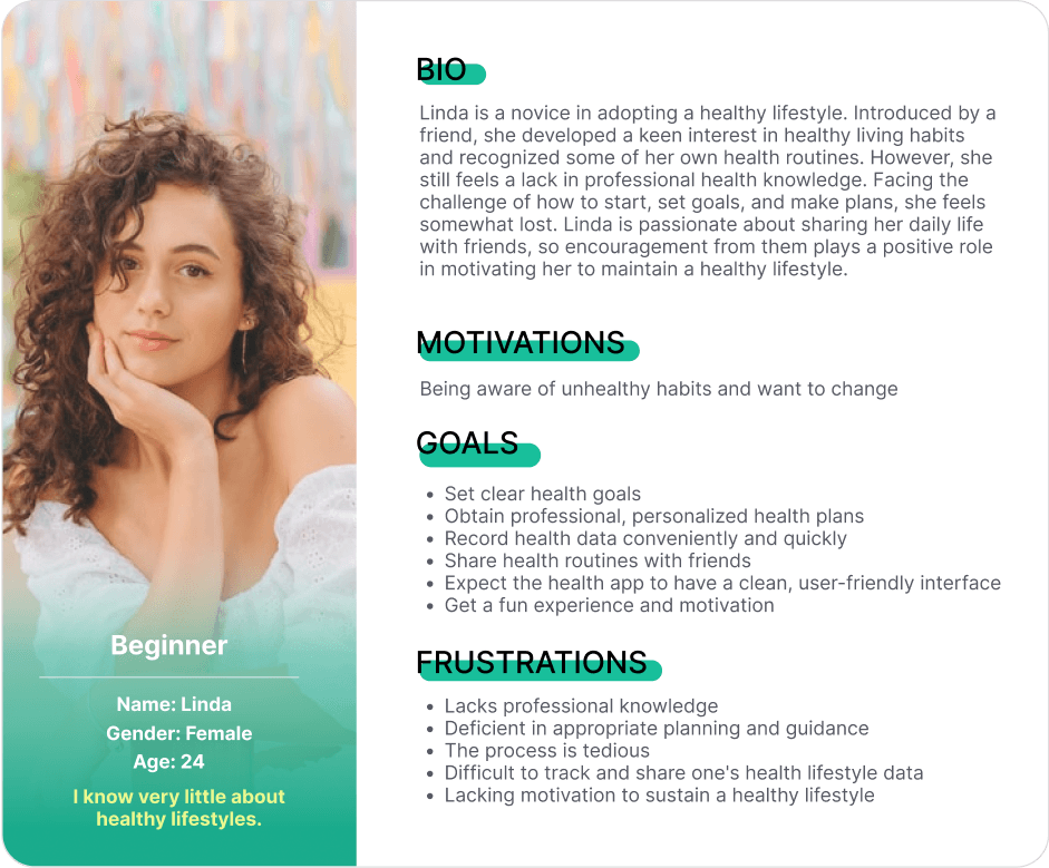 They were beginners, and healthy lifestyle maintainers. After understanding the main characteristics of these two user groups, personas were designed for each type of user.